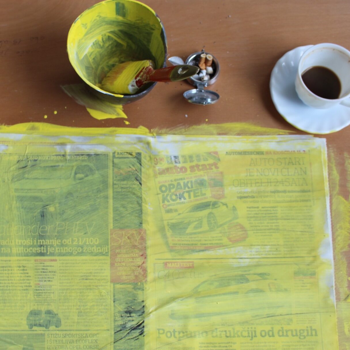 This performative video originates from an everyday routine of drinking coffee, smoking and reading newspapers, which I have reimagined as a ritual that shapes perception and the reception of information. By covering each newspaper page in yellow paint, reading becomes an act of erasure, emphasising and silencing the content simultaneously. The colour yellow operates as a multi-layered symbol of warning, sensationalism and ‘yellow journalism’. The painting process explores the paradox of presence and absence, interrogating the limits of information and the sense of overload imposed by the media.